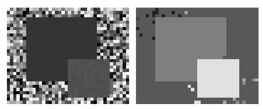 We now turn to a simple synthetic example illustrating some of the non-local image characteristics captured by our segmentation method. Consider the image shown in the top left of Figure 1. Most people will say that this image has three distinct regions: a rectangular-shaped intensity ramp in the left half, a constant intensity region with a hole on the right half, and a high-variability rectangular region inside the constant region. This example illustrates some perceptually important properties that we believe should be captured by a segmentation algorithm. First, widely varying intensities should not alone be judged as evidence for multiple regions. Such wide variation in intensities occurs both in the ramp on the left and in the high variability region on the right. Thus it is not adequate to assume that regions have nearly constant or slowly varying intensities.