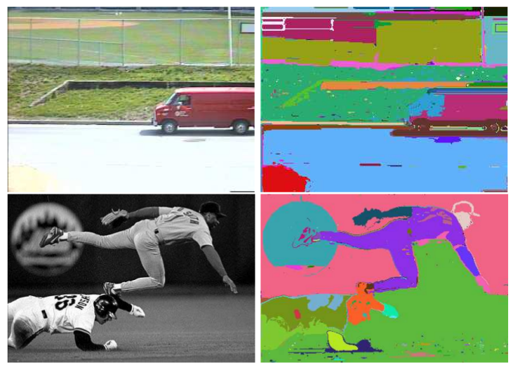 The first image in Figure 3 shows two baseball players (from [14]). As in the previous example, there is a grassy region with considerable variation. The uniforms of the players also have substantial variation due to folds in the cloth. The second image shows the segmentation. The six largest components found by the algorithm are: the back wall, the Mets emblem, a large grassy region (including part of the wall under the top player), each of the two players’ uniforms, and a small grassy patch under the second player. The large grassy region includes part of the wall due to the relatively high variation in the region, and the fact that there is a long slow change in intensity (not strong evidence for a boundary) between the grass and the wall. This “boundary” is similar in magnitude to those within the player uniforms due to folds in the cloth.