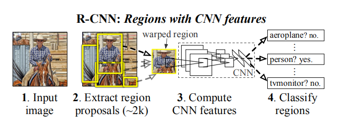 Figure 1: Object detection system overview. Our system (1) takes an input image, (2) extracts around 2000 bottom-up region proposals, (3) computes features for each proposal using a large convolutional neural network (CNN), and then (4) classifies each region using class-specific linear SVMs. R-CNN achieves a mean average precision (mAP) of 53.7% on PASCAL VOC 2010. For comparison, [39] reports 35.1% mAP using the same region proposals, but with a spatial pyramid and bag-of-visual-words approach. The popular deformable part models perform at 33.4%. On the 200-class ILSVRC2013 detection dataset, R-CNN’s mAP is 31.4%, a large improvement over OverFeat [34], which had the previous best result at 24.3%.