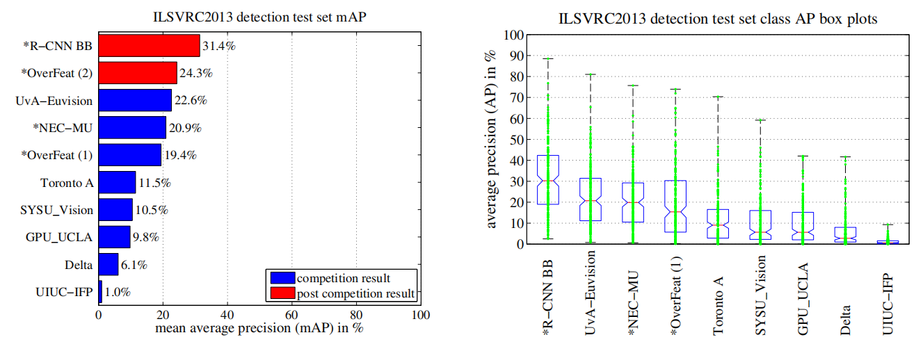 Figure 3: (Left) Mean average precision on the ILSVRC2013 detection test set. Methods preceeded by * use outside training data (images and labels from the ILSVRC classification dataset in all cases). (Right) Box plots for the 200 average precision values per method. A box plot for the post-competition OverFeat result is not shown because per-class APs are not yet available (per-class APs for R-CNN are in Table 8 and also included in the tech report source uploaded to arXiv.org; see R-CNN-ILSVRC2013-APs.txt). The red line marks the median AP, the box bottom and top are the 25th and 75th percentiles. The whiskers extend to the min and max AP of each method. Each AP is plotted as a green dot over the whiskers (best viewed digitally with zoom).