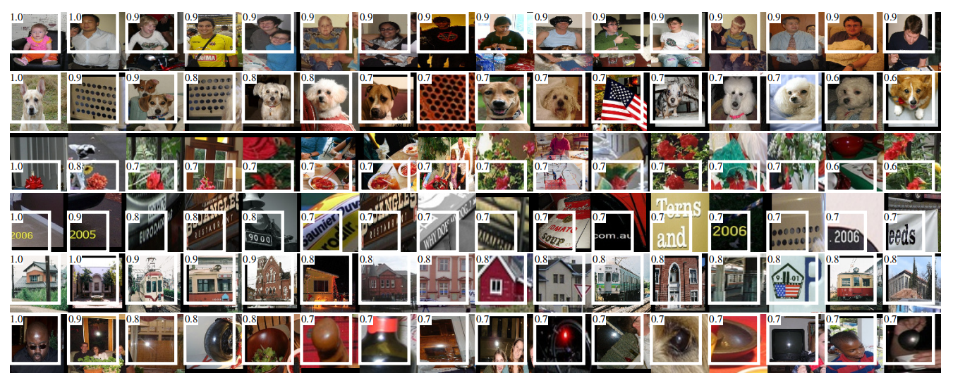 The idea is to single out a particular unit (feature) in the network and use it as if it were an object detector in its own right. That is, we compute the unit’s activations on a large set of held-out region proposals (about 10 million), sort the proposals from highest to lowest activation, perform nonmaximum suppression, and then display the top-scoring regions. Our method lets the selected unit “speak for itself” by showing exactly which inputs it fires on. We avoid averaging in order to see different visual modes and gain insight into the invariances computed by the unit.