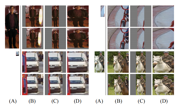 Figure 7: Different object proposal transformations. (A) the original object proposal at its actual scale relative to the transformed CNN inputs; (B) tightest square with context; (C) tightest square without context; (D) warp. Within each column and example proposal, the top row corresponds to p = 0 pixels of context padding while the bottom row has p = 16 pixels of context padding.