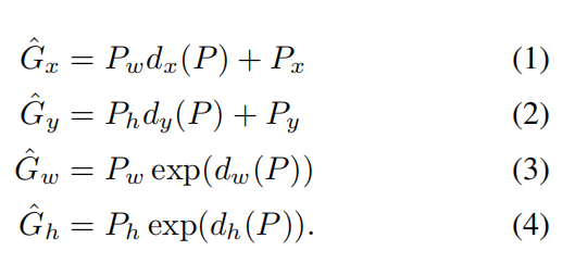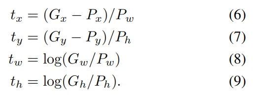 P^{i}=(P^{i}{x}, P^{i}{y}, P^{i}{w}, P^{i}{h}) P^{i} P^{i} G = (G{x}, G_{y}, G_{w}, G_{h})$. Our goal is to learn a transformation that maps a proposed box P to a ground-truth box G.