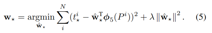 (where is one of x, y, h, w) is modeled as a linear function of the pool5 features of proposal P, denoted by . (The dependence of on the image data is implicitly assumed.) Thus we have $d_{\star }(P) = w^{T}{\star} \varnothing{5}(P) w_{\star } w_{\star }$ by optimizing the regularized least squares objective (ridge regression):