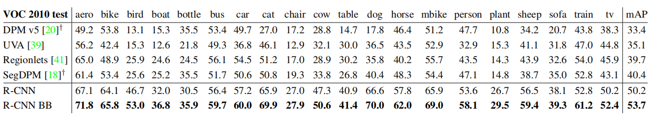 Table 1: Detection average precision (%) on VOC 2010 test. R-CNN is most directly comparable to UVA and Regionlets since all methods use selective search region proposals. Bounding-box regression (BB) is described in Section C. At publication time, SegDPM was the top-performer on the PASCAL VOC leaderboard. †DPM and SegDPM use context rescoring not used by the other methods.