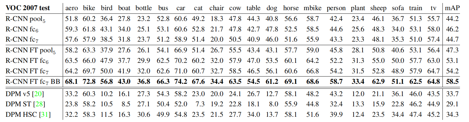 Table 2: Detection average precision (%) on VOC 2007 test. Rows 1-3 show R-CNN performance without fine-tuning. Rows 4-6 show results for the CNN pre-trained on ILSVRC 2012 and then fine-tuned (FT) on VOC 2007 trainval. Row 7 includes a simple bounding-box regression (BB) stage that reduces localization errors (Section C). Rows 8-10 present DPM methods as a strong baseline. The first uses only HOG, while the next two use different feature learning approaches to augment or replace HOG.