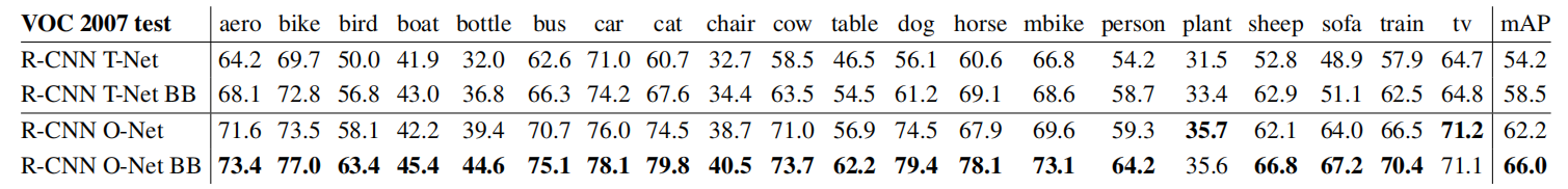 Table 3: Detection average precision (%) on VOC 2007 test for two different CNN architectures. The first two rows are results from Table 2 using Krizhevsky et al.’s architecture (T-Net). Rows three and four use the recently proposed 16-layer architecture from Simonyan and Zisserman (O-Net) [43].