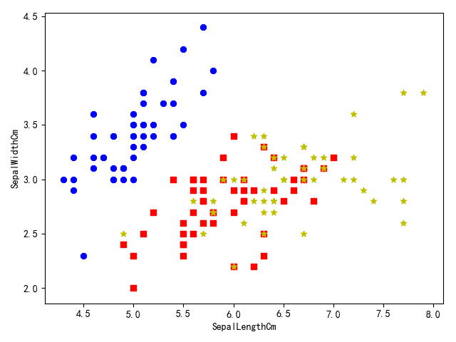 1 2 3 4 5 6 7 8 9 10 11 12 13 14 15 16 17 18 19 20 21 22 23 24 25 26 27 28 29 30 31 32 33 34 35 36 37 def load_data(shuffle=True, tsize=0.8): """ 加载iris数据 """ data = pd.read_csv(data_path, header=0, delimiter=',') # print(data.columns) draw_data(data.values, data.columns) def draw_data(data, columns): data_a = data[:50, 1:5] data_b = data[50:100, 1:5] data_c = data[100:150, 1:5] fig = plt.figure(1) plt.scatter(data_a[:, 0], data_a[:, 1], c='b', marker='8') plt.scatter(data_b[:, 0], data_b[:, 1], c='r', marker='s') plt.scatter(data_c[:, 0], data_c[:, 1], c='y', marker='*') plt.xlabel(columns[1]) plt.ylabel(columns[2]) plt.show() fig = plt.figure(2) plt.scatter(data_a[:, 2], data_a[:, 3], c='b', marker='8') plt.scatter(data_b[:, 2], data_b[:, 3], c='r', marker='s') plt.scatter(data_c[:, 2], data_c[:, 3], c='y', marker='*') plt.xlabel(columns[3]) plt.ylabel(columns[4]) plt.show() # 验证是否有重复数据 # for i in range(data_b.shape[0]): # res = list(filter(lambda x: x[0] == data_b[i][0] and x[1] == data_b[i][1], data_c[:, :2])) # if len(res) != 0: # res2 = list(filter(lambda x: x[2] == data_b[i][2] and x[3] == data_b[i][3], data_c[:, 2:4])) # if len(res2) != 0: # print(b[i])