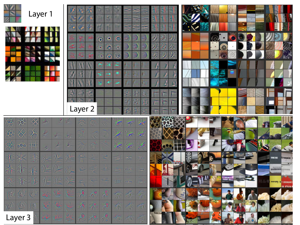 3层有更复杂的不变性(complex invariance),能够捕捉相似的纹理 - 第