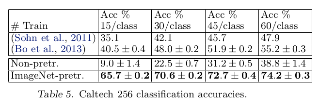 在Caltech-101和Caltech-256数据库上,使用预训练模型能够达到最好的检测结果,重训练模型实现精度远远不及之前最好检测结果