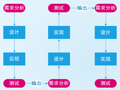 每次迭代都可以看成一个小的瀑布模型,经历过需求分析、设计、实现和测试阶段