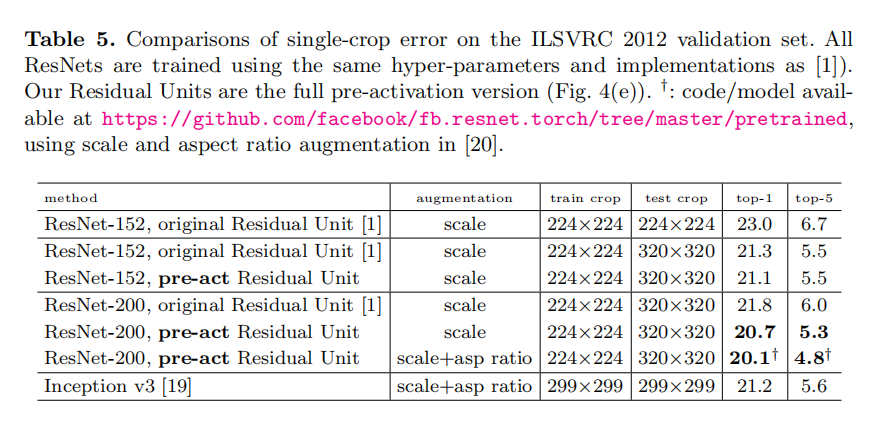 Our pre-activation ResNet-200 has an error rate of 20.7%, which is 1.1% lower than the baseline ResNet-200 and also lower than the two versions of ResNet-152. When using the scale and aspect ratio augmentation of [20,19], our ResNet-200 has a result better than Inception v3 [19] (Table 5). Concurrent with our work, an Inception-ResNet-v2 model [21] achieves a single-crop result of 19.9%/4.9%. We expect our observations and the proposed Residual Unit will help this type and generally other types of ResNets.
