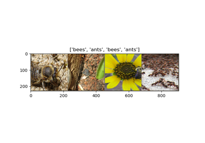 data_dir = 'data/hymenoptera_data' image_datasets = {x: datasets.ImageFolder(os.path.join(data_dir, x), data_transforms[x]) for x in ['train', 'val']} dataloaders = {x: torch.utils.data.DataLoader(image_datasets[x], batch_size=4, shuffle=True, num_workers=4) for x in ['train', 'val']} dataset_sizes = {x: len(image_datasets[x]) for x in ['train', 'val']} class_names = image_datasets['train'].classes