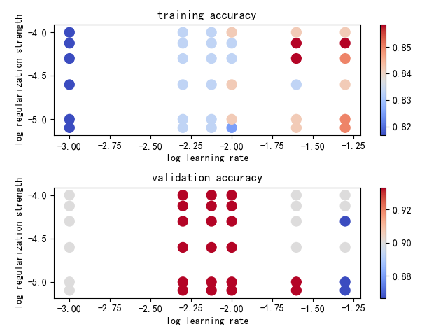 for k in results.keys(): lr, reg = k train_acc, val_acc = results[k] print('lr = %f, reg = %f, train_acc = %f, val_acc = %f' % (lr, reg, train_acc, val_acc))
